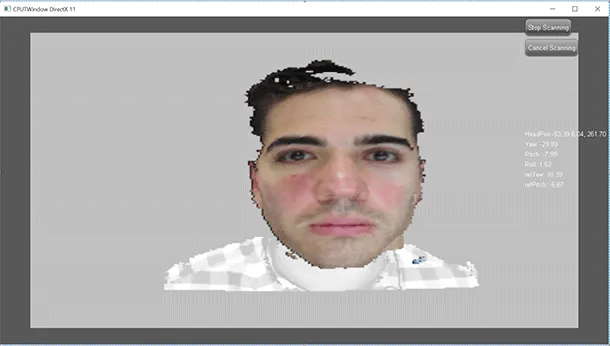 本示例中实施的扫描将引导用户根据英特尔® 实感™ SDK 给出的提示,将头部放在最合适的位置。 满足定位要求后,示例将启用开始扫描按钮。
