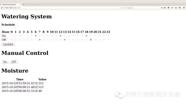 <br>我们可以清晰看到,爱迪生开发板通过一个网页来显示给水计划,控制命令与当前湿度日志记录。</br>