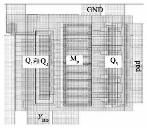 图3显示了改进的SCR ESD保护结构的版图,包括作为ESD保护器件的Q1,Q2和宽长比为180/1的PMOS管Mp,还有就是作为ESD二级保护器件的薄栅管Q3.图中VDD是管子所接的电源端,GND是管子所接的地端。