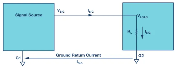 图1显示信号源与负载之间隔开了一段距离,接地G1和G2通过一个回路连接起来。理想情况下,G1和G2之间的接地阻抗为0,因此接地回路电流不会在G1和G2之间产生一个差分电压。