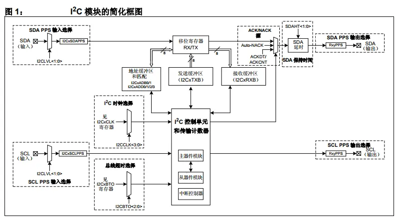 在图 1 中,控制单元包含用于主 / 从工作模式的主器件模块和从器件模块以及用于监视模块状态的中断控制器。传输计数器通过自动计数功能自动传输数据。缓冲区保存数据或地址的一个字节,而另一个字节由移位寄存器在 SDA 引脚上移入或移出。ACK/NACK 源将第 9 位添加到传输来表示应答。这 9 位在由 SDA 延时设置的时间间隔内移出。时钟和总线超时选择分别控制SCL和超时的时序。 SDA 和 SCL 引脚通过外设引脚选择(Peripheral Pin Select, PPS)配置。