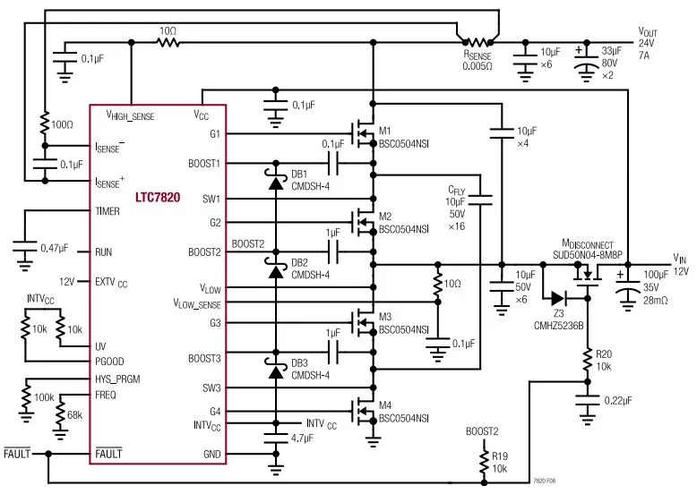 图 1 示出了一款采用 LTC7820 的 170W 输出电压倍增器电路。输入电压为 12V,输出在高达 7A 负载电流条件下为 24V,开关频率为 500kHz。16 个 10μF陶瓷电容器 (X7R 型,1210 尺寸) 起一个跨接电容器的作用,以传送输出功率。