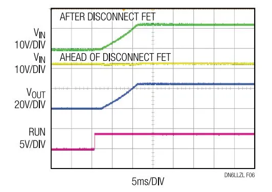 输入的转换速率控制可通过在输入端上采用一个断接FET 或使用热插拔控制器来实现,如 LTC7820 产品手册中的典型应用部分所示。在图 1 中,输入端上采用了一个断接 FET。与分压器解决方案不同,倍压器每次都必须从零输入电压启动,但是它能在具有重负载时直接启动。图 5 示出了在 7A 负载条件下的启动波形。