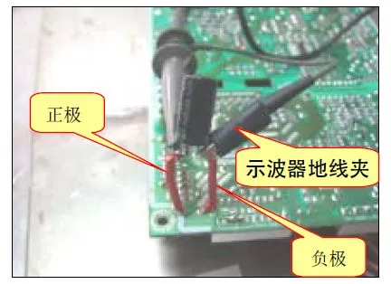 B. 方法(2):在电源板的锡面找出待测电容正负极对应的焊点,焊上两根导线,然后用电压探头夹住引出的导线测试.如下图: