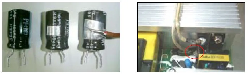 B.当电路板上电容所在的位置周围有发热器件(如功率管,散热片等)时, 将温度感应探测端接于电容靠近发热源的侧面铝壳上,将对着发热源的铝壳表面胶管剥掉一小块,用点温胶直接粘连(或利用热传导率高的银胶带连接,用酒精等东西擦式表面后贴上银色胶带),温度感应探测线另一端连接点温机,如下图:
