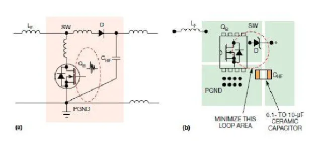 图5 显示的是升压转换器中的热回路与寄生PCB电感(a);为减少热回路面积而建议采用的布局(b)