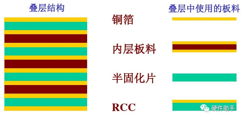 PCB看上去像一个多层蛋糕,制作过程中将不同材料的层,通过粘合剂粘合到一起。从表层开始分别是丝印——阻焊——铜——FR4——铜。铜——阻焊——丝印。其中铜和FR4可以根据实际层数调整厚度,也有很多种类型,包括芯板、基板、光板、PP等等。