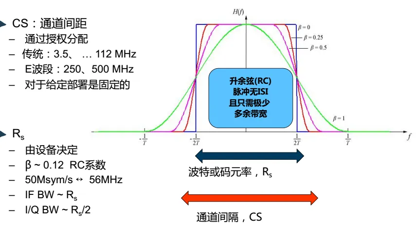 通道间隔与通道带宽或码元速率(波特率)的区别, 下图显示了它们之间的差异。 在点对点系统中,通道间隔一般由主管机构通过授权分配。 所谓的传统波段分配是从3.5 MHz到112 MHz。 对于新的E波段,分配是以250 MHz一段进行,最高可达1或2 GHz,即4段或8段的250 MHz频率。 对于给定部署,这种分配是固定的。