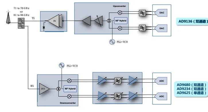 分配了7 GHz,有充裕的带宽可供使用,因而可以使用宽带GSPS转换器。 如果是单一50 MHz通道,考虑前面列出的较低频率转换器会更恰当。如果要聚合多个通道,或者同时传输多个不同通道,那么宽带转换器可能更合适。 因此,针对接收机,图中列出了几款精选1 GSPSADC和AD9625 2.5 GSPS RF ADC;针对发射机,则列出了双通道2.8 GSPS转换器AD9136。 无线电配置为直接变频,基带数据驱动微波调制器,正交解调器驱动到宽带ADC。