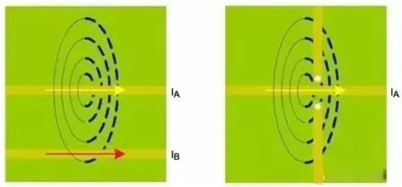 直流电流总是倾向于沿着低阻通路流通。同理,高频电流也是优先流过最低电阻的通路。所以,对于地层上方的标准PCB微带线,返回电流试图流入引线正下方的接地区域。按照上述引线耦合部分所述,割断的接地区域会引入各种噪声,进而通过磁场耦合或汇聚电流而增大串扰(图7)。