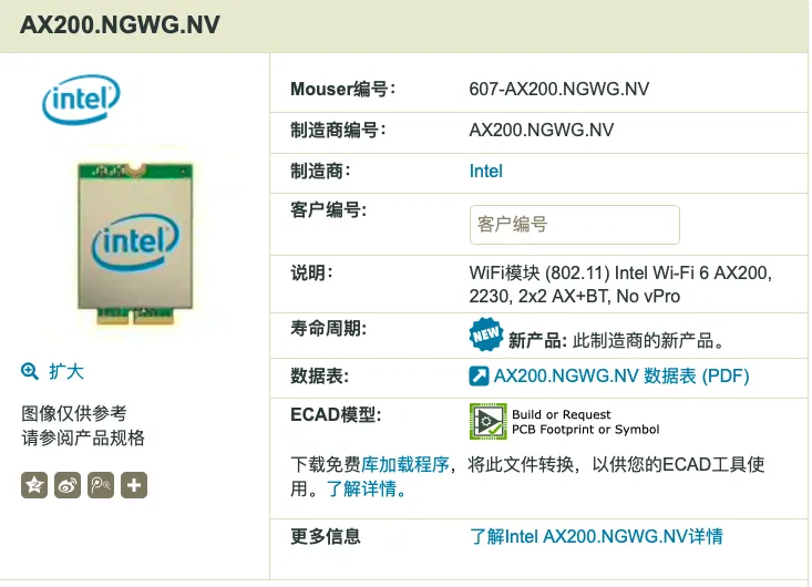 针对Wi-Fi 6技术,贸泽目前供应一款Intel的Wi-Fi 6模块,AX200.NGWG.NV。