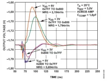 这个16位DAC (R-2R) 输出显示了7FFFh – 8000h代码变化时的短时毛刺脉冲干扰的特性。